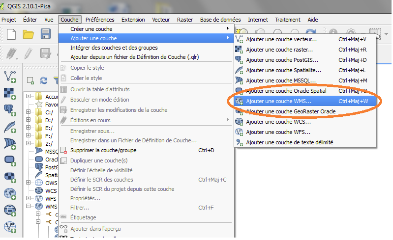 Dans Qgis, Menu "Couche" / "Ajouter une couche", choisissez "Ajouter une couche WMS".