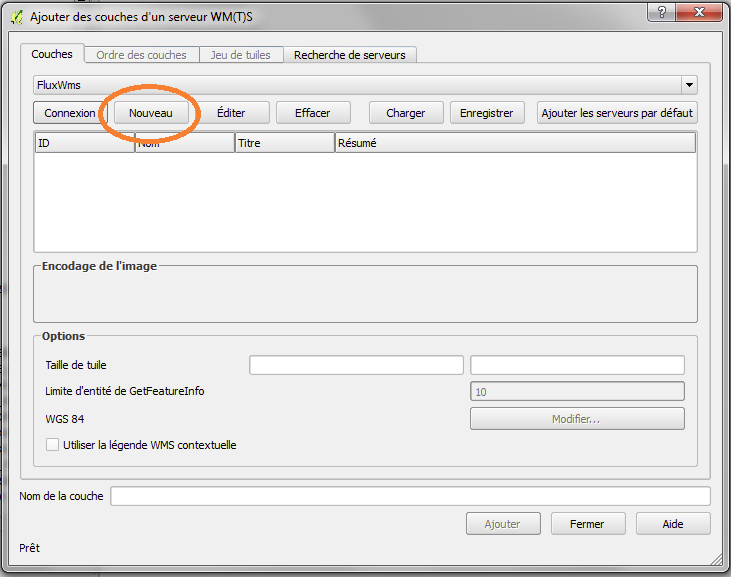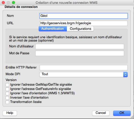 Cliquez ensuite sur le bouton "Nouveau", indiquez l'URL : http://geoservices.brgm.fr/geologie et validez.