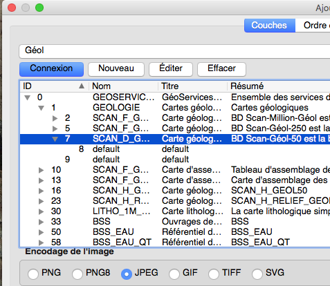 Puis cliquez sur "Connexion" pour récupérer les couches disponibles.