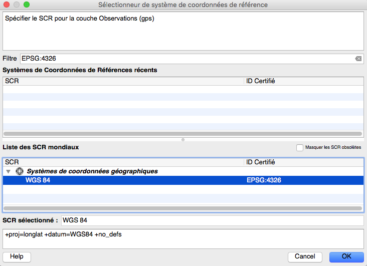 Une nouvelle fenêtre vous demande de choisir le système de projection. Dans la zone de filtre tapez : EPSG:4326 pour sélectionner le bon système.