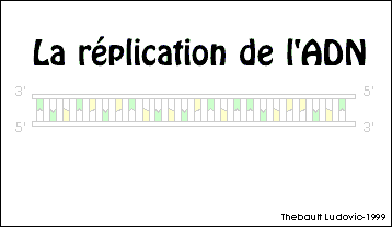 Le rôle des amorcesL'ADN polymérase n'agit pleinement que pour un des deux brins originels. En effet les acides nucléiques possèdent un sens : une extrémité est terminée par le désoxyribose (dont le carbone 3 est libre), l'autre se termine par un groupement phosphate (rattaché au carbone 5 du désoxyribose). On distingue donc l'extrémité 5' et l'extrémité 3'. L'ADN polymérase ne peut fonctionner que dans le sens 5' vers 3'. Pour le second brin (en position 3' 5'), le travail se fait par petits bouts au fur et à mesure que la fourche de réplication s'ouvre et dégage le brin. Une première enzyme, la RNA polymérase (ou ADN primase) fabrique un petit bout d'ARN complémentaire d'une portion du brin 3'5' au niveau de la fourche. Cette amorce d'ARN permet le fonctionnement de l'ADN polymérase &alpha (ou III chez les procaryotes). L'enzyme permet alors de rejoindre la partie du brin déjà répliquée où est encore conservée l'ancienne amorce d'ARN. Une seconde ADN polymérase hydrolyse cet amorce et la remplace par de l'ADN. Les fragments de brins ainsi formés sont ensuite liés entre eux par une autre enzyme : la ligase. ![]() De nombreuses erreurs sont commises au cours de la réplication mais les enzymes reconnaissent et corrigent ces erreurs. Par exemple l'ADN polymérase reconnaît les mauvais appariements. Elles permettent également la réparation de l'ADN lorsque celui-ci est abîmé par des rayonnements (rayons X, radioactivité, rayons U.V...) ou des substances chimiques. Un grand nombre d'enzymes participent à cette réparation. Généralement la partie endommagée de l'ADN est enlevée (excisée) et remplacée selon le même mécanisme que la réplication (excepté qu'il n'y a pas d'il de réplication).