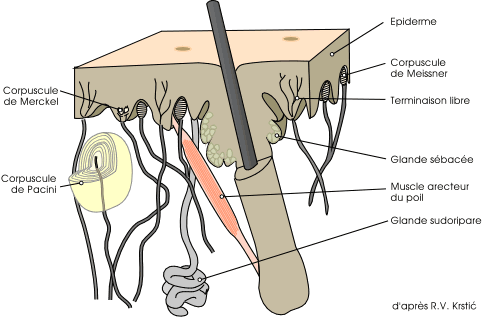 base des poils) et aux vibrations (Pacini).