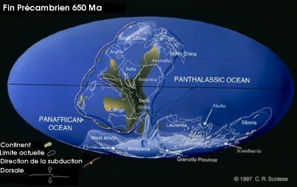 Les blocs continentaux se réunissent sous la forme d'un supercontinent, le Rodina (vers 650 millions d'années), puis commencent à se séparer en plusieurs grandes masses continentales:- La Laurentia, constituée des boucliers canadiens, groenlandais et hébridiens (Nord de l'écosse et îles des Hébrides) ainsi que des plateformes Nord-Américaines,