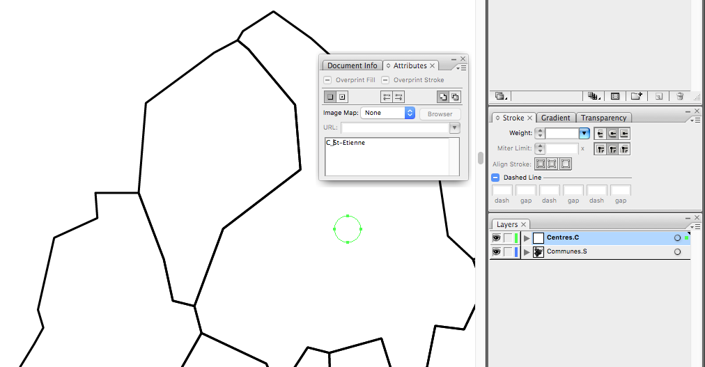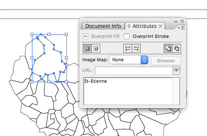 Chaque secteur de la carte doit être un objet unique de type polygone ou cercle et doit être nommé avec un identifiant unique en utilisant la fonction Notes d'Illustrator (palette "Attributs" et option "Voir les notes"). Ce nom devra être identique à celui utilisé dans le fichier de données.