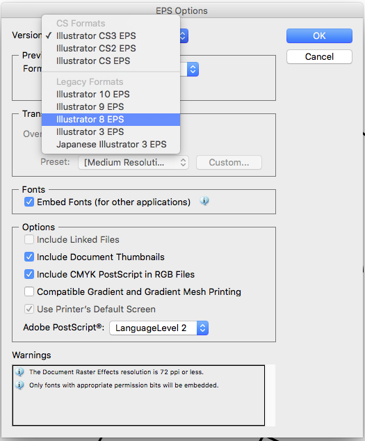 Enregistrez votre fichier au format Illustrator 8 EPS :