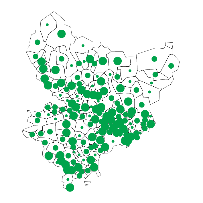 Si plutôt que de colorier le secteur complet, vous souhaitez plutôt afficher en son centre un cercle de diamètre différent selon la valeur, 3 tailles de cercles sont possibles, et l'on peut choisir de remplir le cercle ou non, ce qui offre 7 possibilité (avec le fait de ne rien afficher). Pour rendre cette présentation possible, il vous faut nommer le calque qui contient les secteurs en rajoutant ".S" à la fin du nom et créer un calque en lui donnant un nom terminé par ".C" dans lequel vous placerez un cercle, sans fond ni bordure, du diamètre minimal à utiliser (le grand diamètre sera 2 fois plus grand), au centre de chaque secteur. Il faudra également indiquer en note l'identifiant du secteur en le préfixant de 'c_".